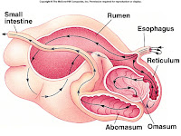 The word rumination comes from rumen,a word of uncertain origin. Some animals, often referred to collectively as ruminants, have a multi-compartment stomach and typically eat grass and leaves. Food from the oesophagus goes into the first chamber, or rumen,where it is fermented by microbes to break down cellulose. No animal can digest cellulose, the major constituent of plants, without help from symbiotic microbes living in their gut. After fermentation the wodge of partially digested food, or cud, can be regurgitated to be further chewed. This act of re-chewing food is called "chewing the cud" a characteristic of ruminant animals. When it is re-swallowed it carries on through the alimentary canal.